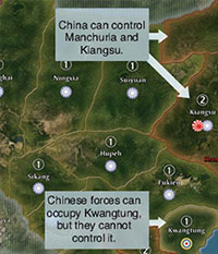 Chinese eenheden hebben een beperkt bereik van de bezetting, weergegeven door de gekleurde rand. Ze kunnen ook worden verplaatst naar Kiangsu en Mantsjoerije.