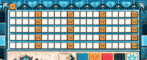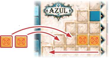 Go through your pattern lines from top to bottom. Move the rightmost tile of each complete line to the space of the same color in the corresponding line of your wall. Each time you move a tile, score points immediately (see Scoring).