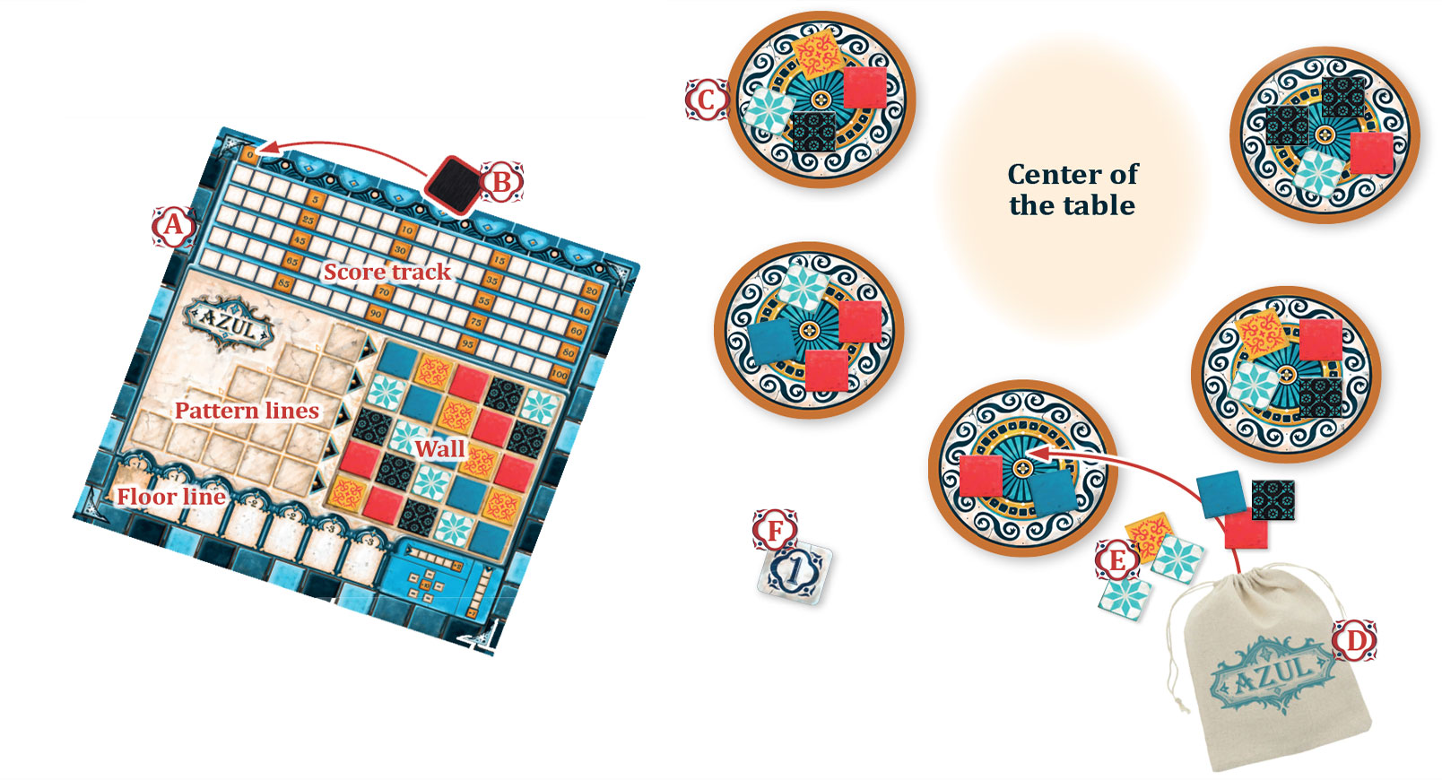 Or: Pick all tiles of the same color from the center of the table. If you are the first player in this round to pick tiles from the center of the table, also take the starting player marker and place it onto the leftmost free space of your floor line.