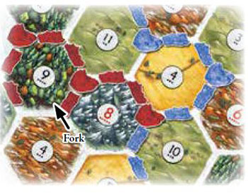 Since the settlements and keeps usually border on 2-3 terrain types, they can "harvest" up to 3 different resources based on the dice roll. Here, the yellow settlement [C] borders on forest, mountains, and pasture.