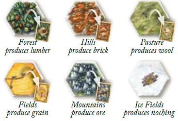 How do you get resources? It's simple. Each turn, 2 dice are rolled to determine which terrain hexes produce resources. Each terrain hex is marked with a round number token. If, for example, a "10" is rolled, all terrain hexes with a "10" number token produce resources - in the illustration on this page, those terrain hexes are mountains (ore) and a pasture (wool).