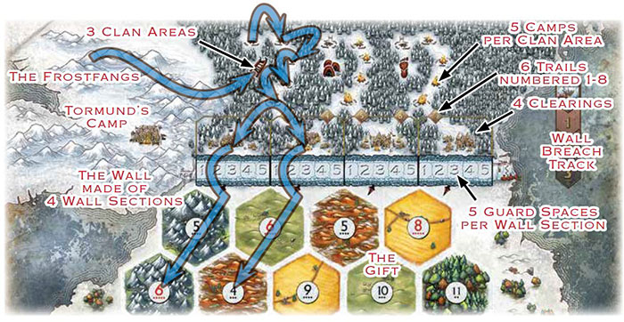 The Gift is bounded by the Starks' kingdom to the south and the seas to the east and west. To the north stands the Wall-the towering dam holding back the wildlings and the other horrors of the northern wastes. You must settle and expand your holding in the Gift. After all, starving and poorly armed men make poor guards.