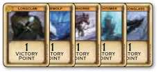 As long as you have 3 guards anywhere on the Wall, you receive 1 VP token. As long as you have 5+ guards anywhere on the Wall, you receive 1 additional VP token (2 VPs total). If the number of your guards on the wall falls below either threshold, return the VP token to the supply.
