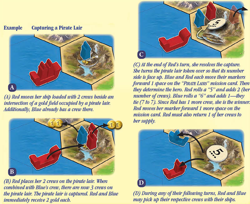 If there is still a tie, the tying players repeat the die roll. If you capture a pirate lair all by yourself, you automatically move your marker forward 1 space. You also lose 1 of your crews.