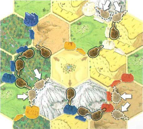 Since the Cataners always have a few sheep and grain sheaves left over, the nomads send out caravans to trade for the desired raw materials. Three caravan routes are formed with the camels. All settlements and cities on the caravan route count for one more victory point.
