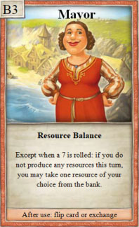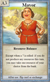 1× during your turn, when purchasing a development card, you can replace 1 of the 3 resources it costs with any other. Select the development card from the first 3 in the stack. Then, shuffle the stack.