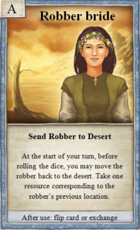 On your turn (even before rolling the dice), you can move the robber to the desert. You receive 1 resource from the landscape from which you pulled the robber.