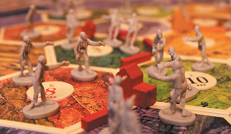 Starting with the first turn, every time a player rolls the dice, that player places a zombie token in the hex of the rolled dice number. If there are multiple hexes with that number, the player chooses which hex to place the zombie token.