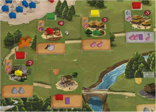 Each player chooses a color. They take the corresponding Houses and place 1 of them under the Guilds Bridge 10.They also take Workers in their color. The number of Workers is based on the number of players: