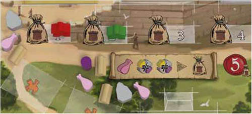 Example: Red and Green have each placed 1 Worker on the Construction Site. Red, placed on space 1, delivers a bundle (and gains 5 Prestige Points) while Green delivers 2 bundles (and gains 10 Prestige Points).