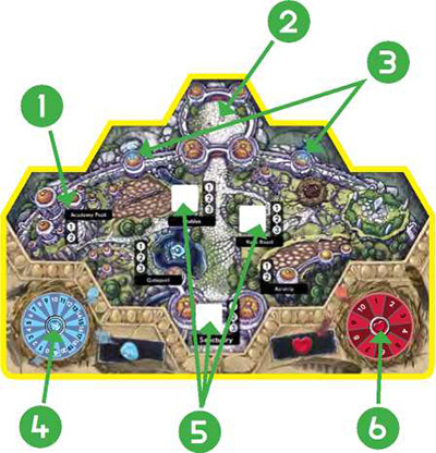 1 Fortress Advancements, 2 Fortress Gate Hex, 3 Fortress Source Wells, 4 Source Tracker, 5 Fortress Advancement Die Slots, 6 Fortress Gate Health Tracker.