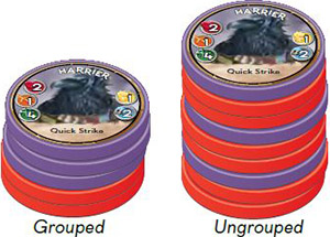 When the top minion is defeated, the next minion in the group becomes active and is immediately given health chips equal to its health stat. Extra damage dealt to the top grouped unit does not carry over to the next unit.