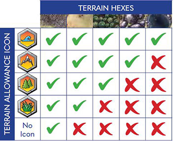 Units may travel on any hexes of this terrain type, as well as any hexes with terrain types of lower difficulty. The following chart shows exactly what terrain types may be moved on or through with each terrain allowance: Terrain Hexes