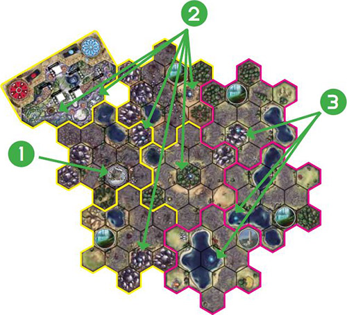 1 Heir Spire, 2 Source Wells Within Influence, 3 Source Wells Outside of Influence.