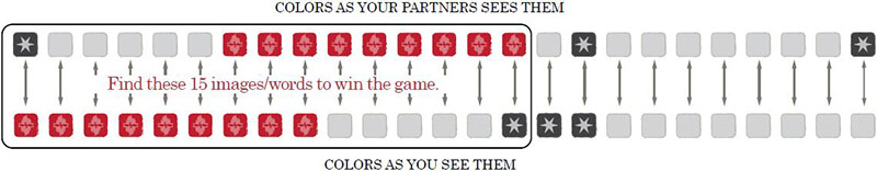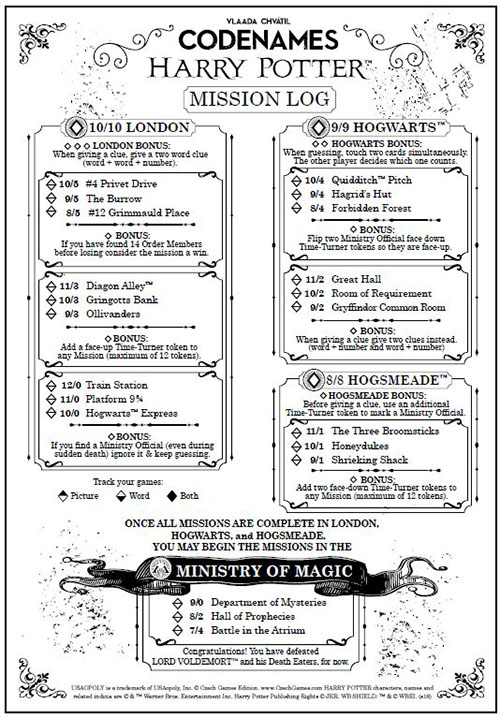 If you are an expert Codenames player and want an even greater challenge, remove one Time-Turner token from each mission. Or, you may add an additional rule: for each set of three missions, one mission has to be played with pictures, one with words and one with combination of both.