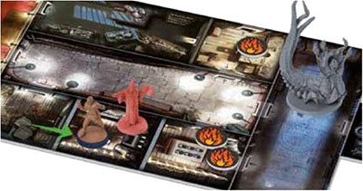 Ian has 3 successes to distribute as hits. He decides to use 2 to kill the Cultist, removing the figure and, using his Brawling skill, applies the last success as a hit to the Fire Vampire.