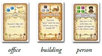 Under these is the name of the card (with a background noting the kind of card: office (yellow), building (red-brown), and person (gray). Below this is text which describes what the card does.