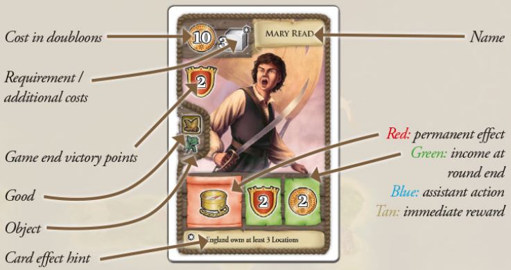 If the costs are goods or objects, you must discard cards from your hand that shows these goods or objects. Pay doubloons or figures to the general supply. Pay combat points by adjusting your marker.