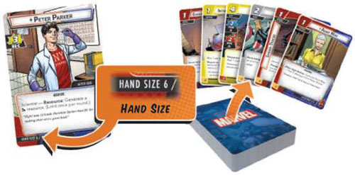 Draw Cards. Each player draws a number of cards from their player deck equal to their hand size, which is listed near the bottom left corner of their identity card.