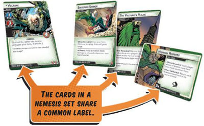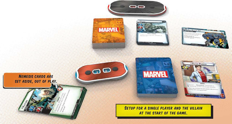 Remove all of the spider-man nemesis cards from the spider-man deck and set them aside. Remove all of the captain marvel nemesis cards from the captain marvel deck and set them aside.