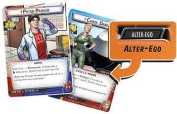 Remove the spider-man/peter parker identity card from his deck and (if a second player is playing) remove the Captain Marvel/Carol Danvers identity card from her deck. set each card to its alter-ego side.