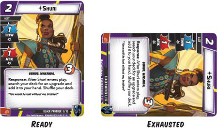 Cards enter play in a ready position (upright). In order to use some card powers and abilities, the card must exhaust, which is indicated by rotating the card sideways A card in the exhausted position is not able to exhaust again until it is ready (upright).