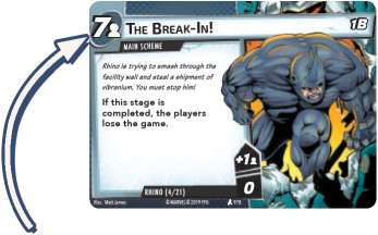 To complete this scheme, the villain must accumulate 7 threat per player on it. as it is the final (and only) card in the Rhino scheme deck, Rhino wins the game if it is completed.