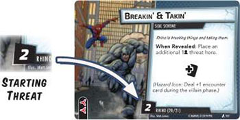 Place threat on the main scheme equal to the villain's modified SCH value. (Threat is placed on a scheme using threat tokens).