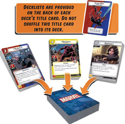 The Spider-Man, Captain Marvel, and Rhino decks have been pre-sorted in the core set for convenience. Only the cards in these three decks are used in the tutorial game.