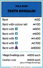 Move your piece to the In Jail space immediately! Do not collect M200 for passing GO. Your turn is now over. You can still collect rent, bid during auctions, buy Village Dwellings and Castles, mortgage and trade while you are in Jail.