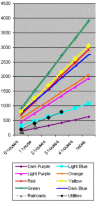 Bear in mind, though, that Illinois, New York, and Boardwalk have higher chances of getting landed on than many of the other properties, with Illinois the highest. Don't mortgage these properties if you can avoid it.