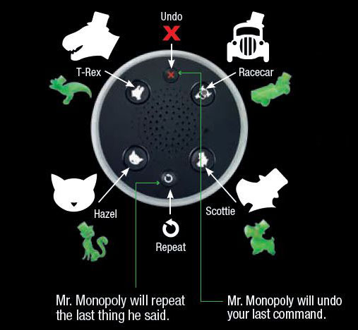 Use the Repeat button when you need Mr. Monopoly to repeat the last thing he said.