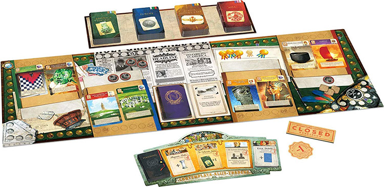 Each player draws one card from each Continent deck and one from the Favour deck to form their starting hand. If a Public Opinion card is drawn, shuffle it back into the deck.