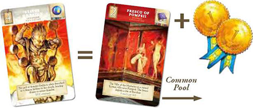 Example: Olivier wants to place the Statue of Raijin (value: 4) into his Museum. He Discards the Fresco of Pompeii (value: 2) and two Prestige points (value: 2) to pay for it. He could also discardfour Prestige points to pay for the statue if he so wished.