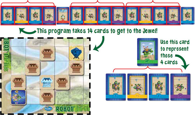 Explain to the Turtle Masters that the goal now is to use as few cards as possible to reach the Jewel. The Function Frog is a friend of the Robot Turtles and he can help!
