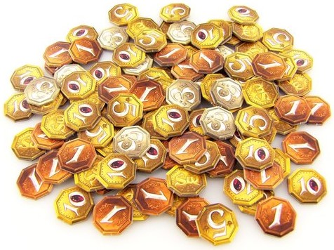 You start the game with 5 Victory Coins and these are your currency for buying your army. The top of the line up is the pile of upcoming races (underneath the Fortified Humans). The race at the bottom of the line up will cost you zero and each race above it will cost one Victory Coin for each tile below it. There is a unique mechanic in that the coins you pay go onto the choices you bypassed.