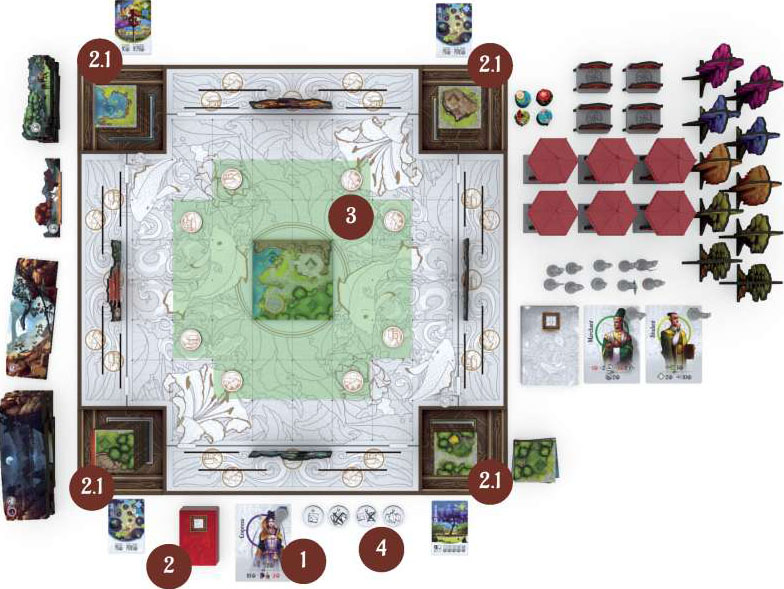 This game mode does not use the spaces around the edges of the board. Decoration cards are not collected, character's abilities are not available, and player boards are not used.