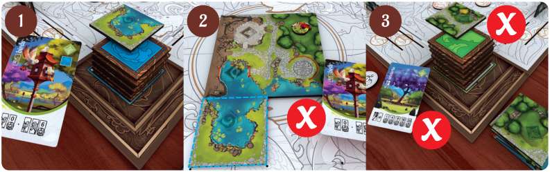 Each turn you must select and place one available garden tile and the decoration represented by the card next to it. It must be possible to place both the tile and the decoration, otherwise the pair cannot be selected.