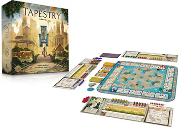 3 Tapestry cards (x50): Shuffle the tapestry cards and place the deck face down next to the board.