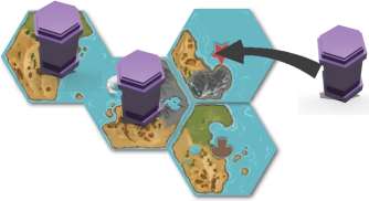 First, select 1 territory tile from your supply and place it on an unexplored hex adjacent to a territory you control, oriented in any direction: