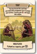 If you attempt to conquer a territory controlled by an opponent, beware of trap cards! Trap cards are disguised as tapestry cards, but if the opponent discards one from their hand, they will retain control of the territory (you still gain a benefit from the conquer dice).