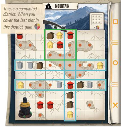 When you complete a district by filling all plots in one of the nine indicated 3x3 areas, immediately gain any 1 resource.