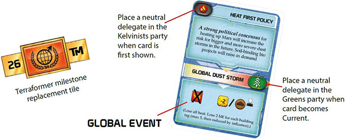 Boards: Place the Terraforming Committee board and Global Event board next to the main game board. If playing on the base game board (Tharsis), replace the Terraformer milestone with the new badge, requiring only TR 26.