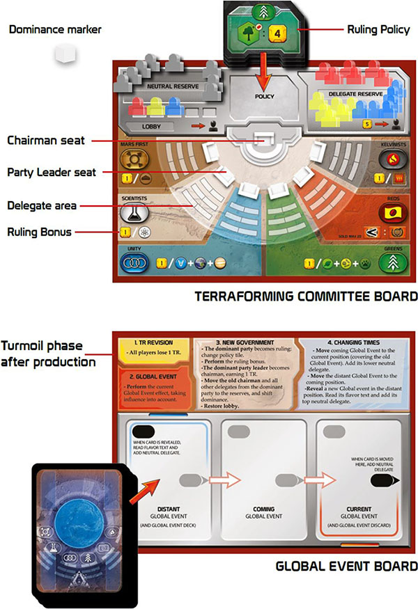 The Global Event places neutral delegates in the Terraforming Committee. The gray neutral Delegate markers do not belong to any player, but they do count as a separate player. These neutral delegates can become Party Leader and Chairman.