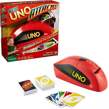 Challenge UNO Attack! - This game is scored by keeping a running total of what each player is caught with in his or her hand. As each player reaches a designated amount, we suggest 500, that player is eliminated from the game.