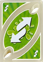 When you play this card, the direction of play reverses (if play is currently to the left, then play changes to the right, and vice versa). This card may only be played on a matching color or on another Reverse card.
