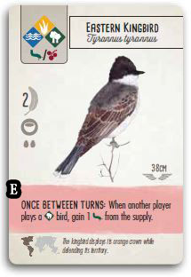 E Once Between Turns (pink): These powers may be triggered on opponents' turns. You can only use a pink power once between each of your own turns (if an opponent triggers it). We recommend telling other players what the power is, and what activates it. Players should help each other notice when a bird with a pink power should be activated.