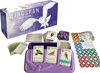 The European Expansion also includes an additional tray for storing the growing collection of birds (past, present, and future), as well as 15 purple eggs, extra food tokens, new end-of-round goals and bonus cards, and a colorful new scorepad designed for both multiplayer and solo scoring.